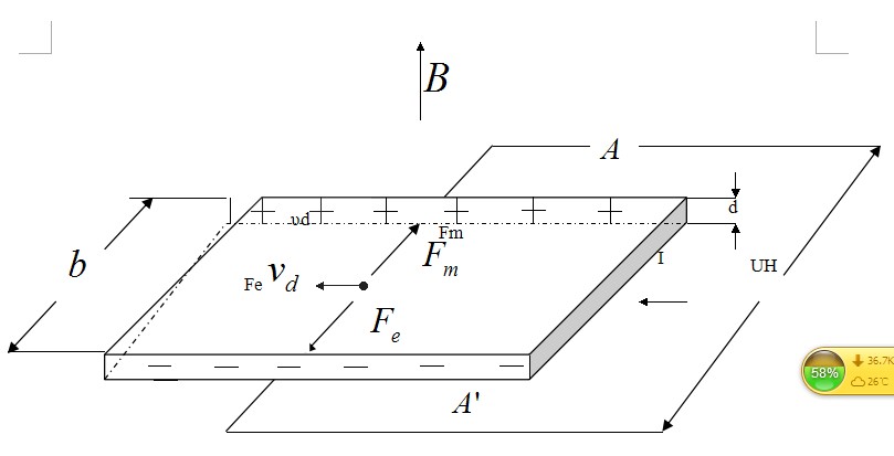 所謂霍爾效應(yīng):相當于把一塊寬為b,厚為d的導(dǎo)電板放在磁感應(yīng)強度為B的磁場中,并在導(dǎo)電板中通以縱向電流I ,此時在板的橫向兩側(cè)面A、A′,之間就呈現(xiàn)出一定的電勢差,這一現(xiàn)象稱為霍爾效應(yīng),所產(chǎn)生的電勢差UH稱霍爾電壓。高斯計就是利用這一原理來測量磁場強度的。如圖所示: